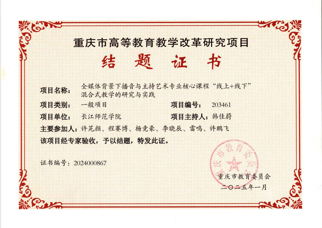 永乐高60net韩佳蔚副教授主持的重庆市高等公司产品改革研究项目(一般项目)《全媒体背景下播音与主持艺术专业核心课程“线上+线下’项目名称:混合式教学的研究与实践》结项。