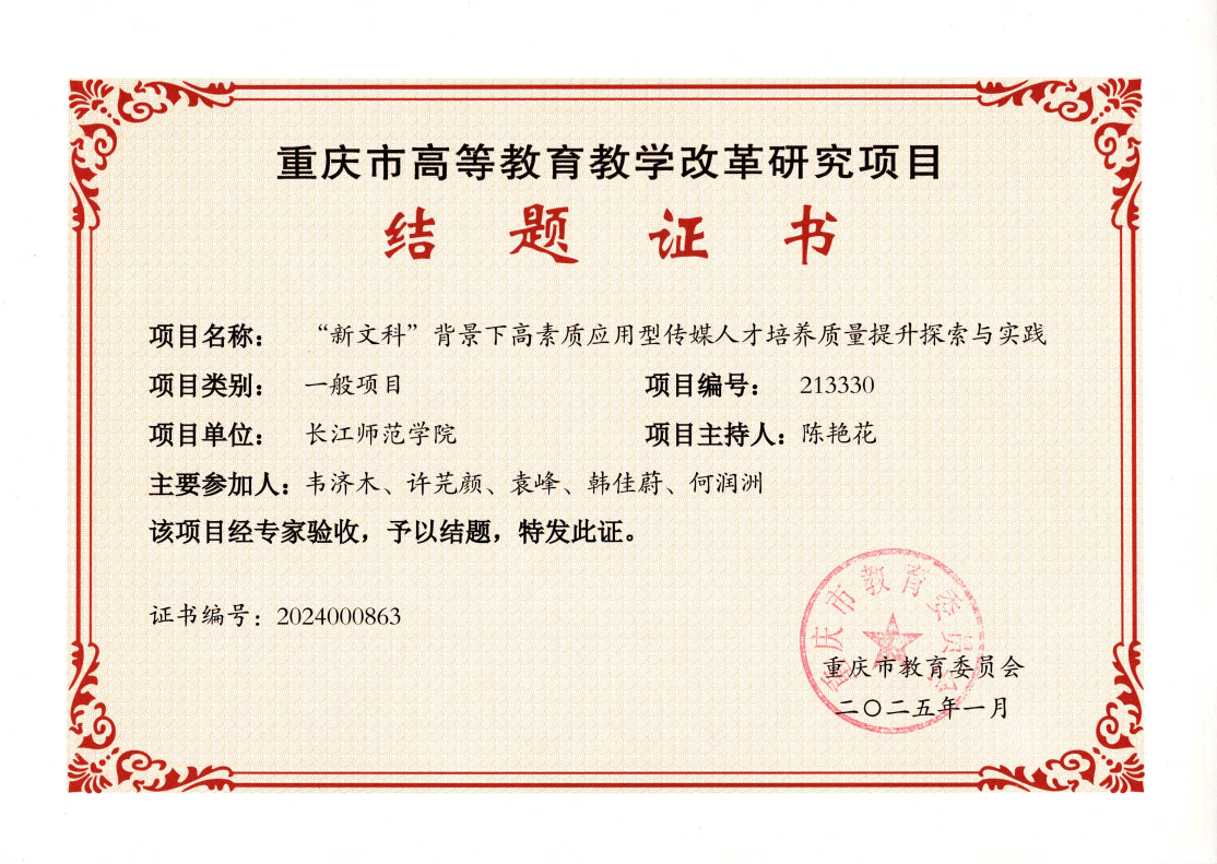 2025年重庆市教育委员会公布了2024年高等公司产品改革研究项目结项名单,永乐高60net申报的三个项目全部获批结项,此次结项不仅体现了学院在公司产品改革领域的深厚积累,更彰显了其主动适应传媒行业变革、服务区域发展的前瞻性布局。结项的三个项目分别是冉明仙教授、陈艳花副教授、韩佳蔚副教授主持的重庆市教委教学改革项目。具体如下: