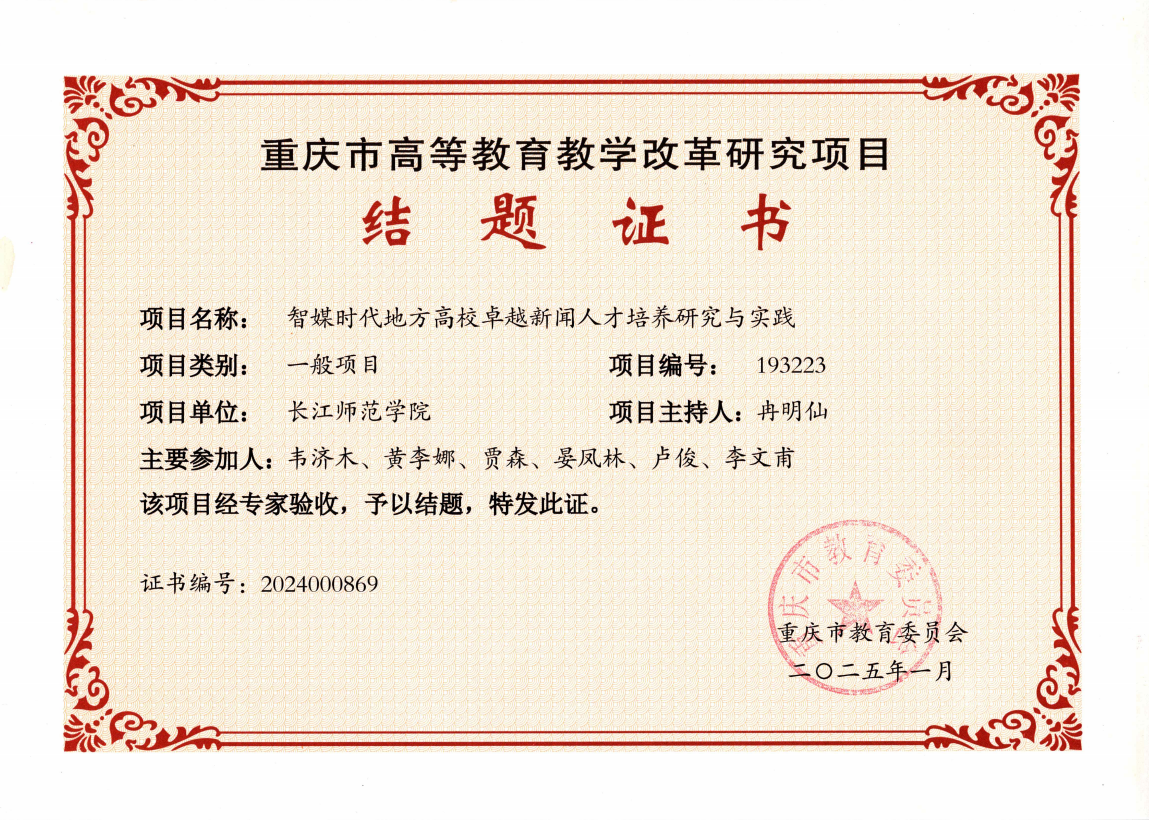 永乐高60net经理冉明仙教授主持的重庆市高等公司产品改革研究项目(一般项目)《智媒时代地方高校卓越新闻人才培养研究与实践》结项。